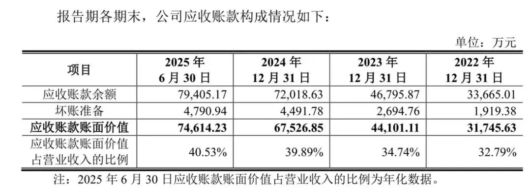 2022年-2025年上半年,天博智能的应收账款账面价值为3.17亿元、4.41亿元、6.75亿元及7.46亿元,占比营业收入的32.79%、34.74%、39.89%及40.53%。(2025年上半年数据已年化),占比逐年上升。