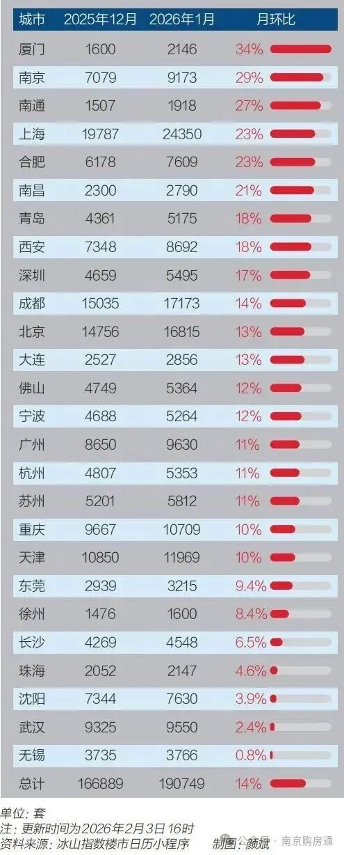 二手房方面,根据冰山指数,合肥1月二手房成交7609套,环比上涨23%,与上海并列第4。