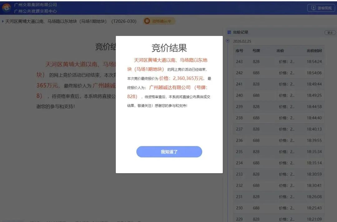2月25日,广州天河区马场地块历经243轮鏖战、近9小时竞价,最终被越秀集团以236亿元总价摘得,溢价26.6%,折合住宅楼面价8.5万元/平方米,创下广州住宅楼面价新高。