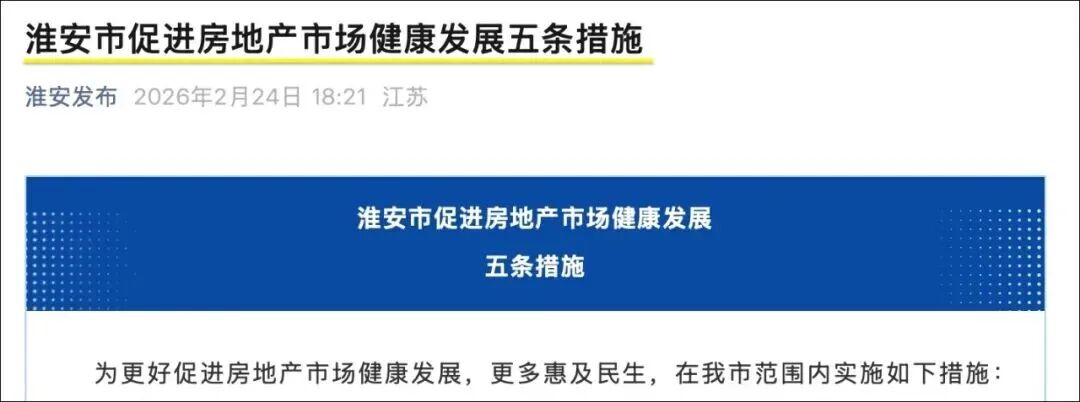 2月24日,淮安市发布《促进房地产市场健康发展五条措施》,打出“补贴组合拳”。