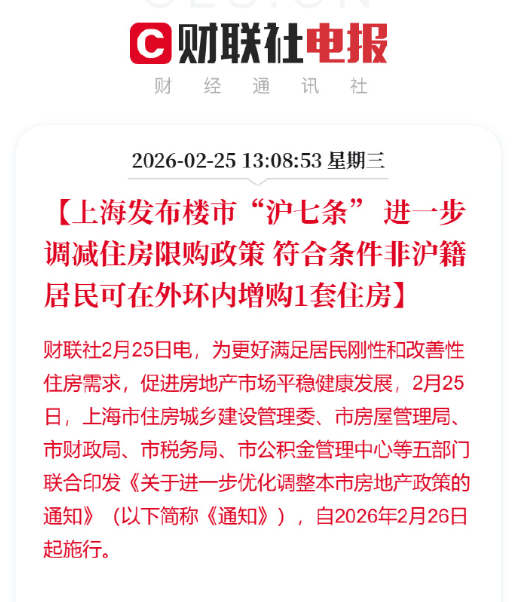 2月25日,上海发布马年首个楼市新政——“沪七条”,从限购、公积金、房产税三大维度协同发力。