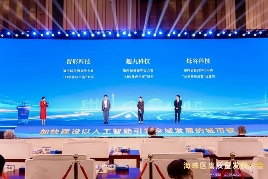 在启动仪式上,趣丸科技、烁谷科技、留形科技三家企业的代表分享了其通过大赛实现跃升式发展的故事。作为第四届琶洲算法大赛“AI软件应用赛”冠军,趣丸科技在去年9月推出全球首款将生成式AI技术深度融入吉他演奏体验的智能乐器——TemPolor Melo-D智能吉他,该产品在海外拿下伦敦设计金奖、纽约产品设计银奖两个世界级设计奖项。烁谷科技通过大赛迭代语音生成技术,其VocuV3语音模型于2025年12月登顶HuggingFace TTS Arena全球语音评测榜第一名。留形科技通过第四届算法大赛平台验证建筑、家装、巡检等多场景商业模式,并实现了规模化落地,企业核心创始人凭借其过硬的技术及商业能力,成功入选2025福布斯中国30 Under 30榜单。