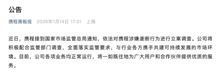 最后值得注意的是,就在这份亮眼财报发布前的一个月(2026年1月),携程收到了一份沉重的“新年礼物”——国家市场监管总局根据《反垄断法》对其启动调查。