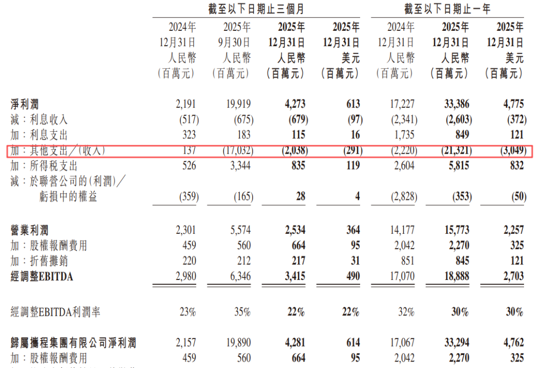 2025年全年,携程包含在其他(支出)/收入中的投资利得高达213.21亿元,而在2024年,这个数字仅为22.2亿元。
