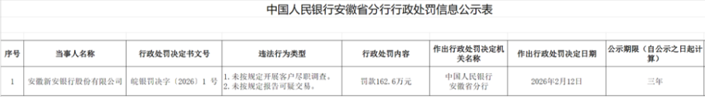 2月25日,中国人民银行安徽省分行公布一则罚单,安徽新安银行因未按规定开展客户尽职调查、未按规定报告可疑交易被罚款162.6万元。