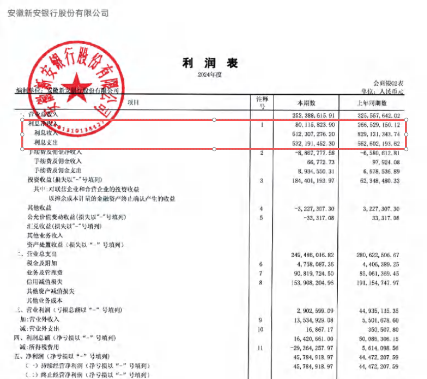 与此同时,该行营收出现下滑。2024年,安徽新安银行实现营业收入2.52亿元,同比下滑22.47%;净利润为4578.49万元,同比增长2.95%。营收下滑主要由于利息净收入的下降,2024年,该行实现利息净收入8011.58万元,同比下滑69.94%。