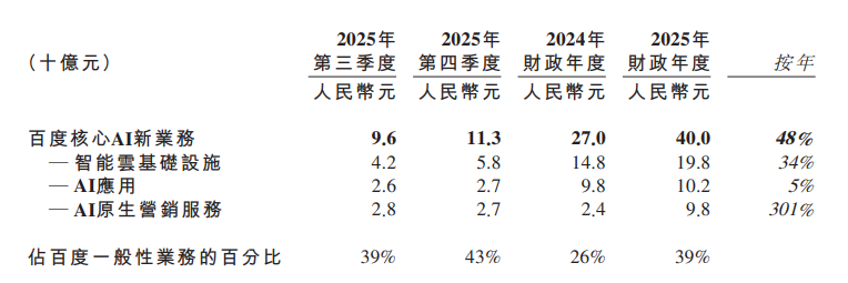 具体来看,百度核心AI新业务方面,2025年第四季度,智能云基础设施收入为人民币58亿元,AI高性能计算设施的订阅收入同比增长143%。2025年全年,智能云基础设施收入约为人民币200亿元,同比增长34%。