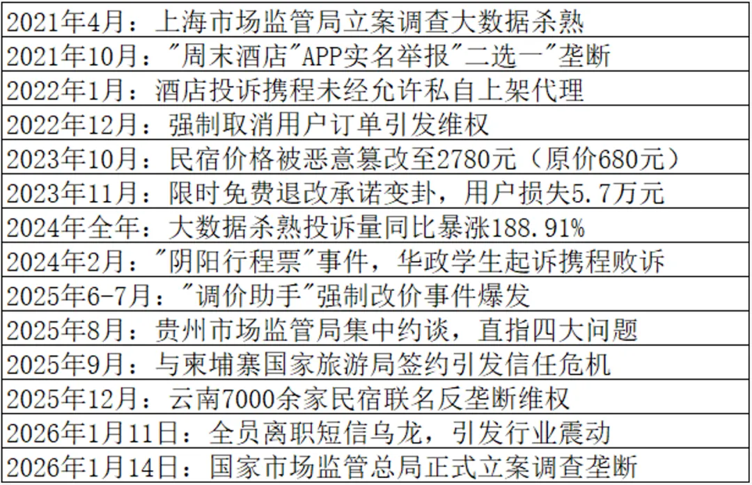 有人做了一个统计,近五年,在携程身上一共发生过十多起舆论事件,主要聚焦于“反垄断”“价格争议”“服务纠纷”“数据安全”相关内容。