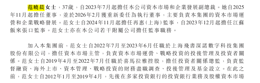 而其公司秘书是范晓晨女士,她自2023年7月起任资本市场和企业发展副总裁,2025年11月起任董事,2026年2月再任执行董事,负责资本运营与战略发展。