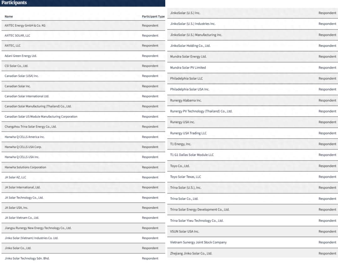 First Solar此次要求调查的47家光伏企业涉及中国、德国、印度、日本、韩国等多国企业。其中,具有中国背景的企业共有29家(包含境外子公司),分别是润阳股份(5家)、阿特斯(6家)、天合光能(5家)、晶澳科技(5家)、晶科能源(8家)。