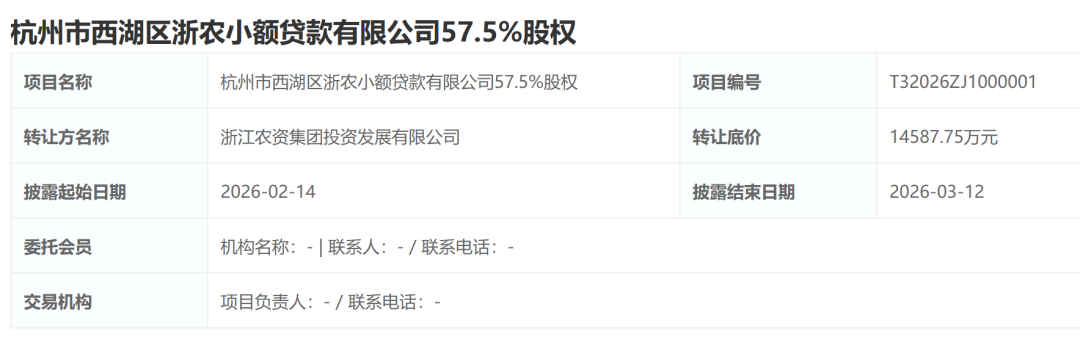 近日,全国产权行业信息化综合服务平台披露一则股权转让信息,杭州市西湖区浙农小额贷款有限公司(下称“浙农小贷”)57.5%股权正式挂牌,转让底价定格为14587.75万元(约1.46亿元)。此次转让方为浙江农资集团投资发展有限公司(下称“浙农集团”),转让股权为其持有的浙农小贷全部股份,标志着这家国资背景企业将彻底退出浙农小贷的经营管理。