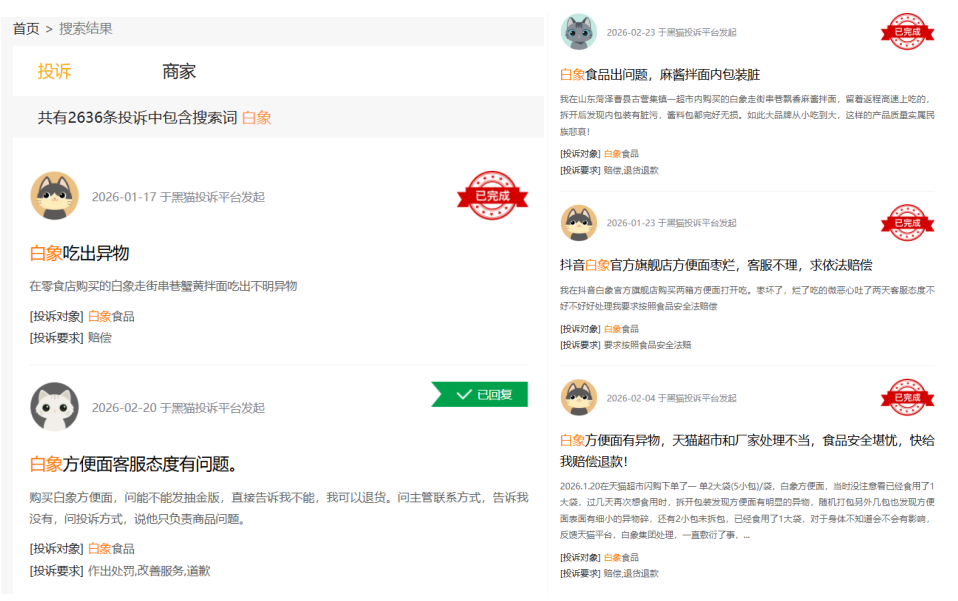 产品短板与诚信缺失的叠加影响,直接导致市场反馈持续恶化。仅在黑猫投诉,截至2026年2月,关于白象食品的相关投诉已达2636条。近期投诉集中在食物变质、包装内有异物等食品安全问题,同时涵盖虚假宣传、售后响应迟缓等多个维度。