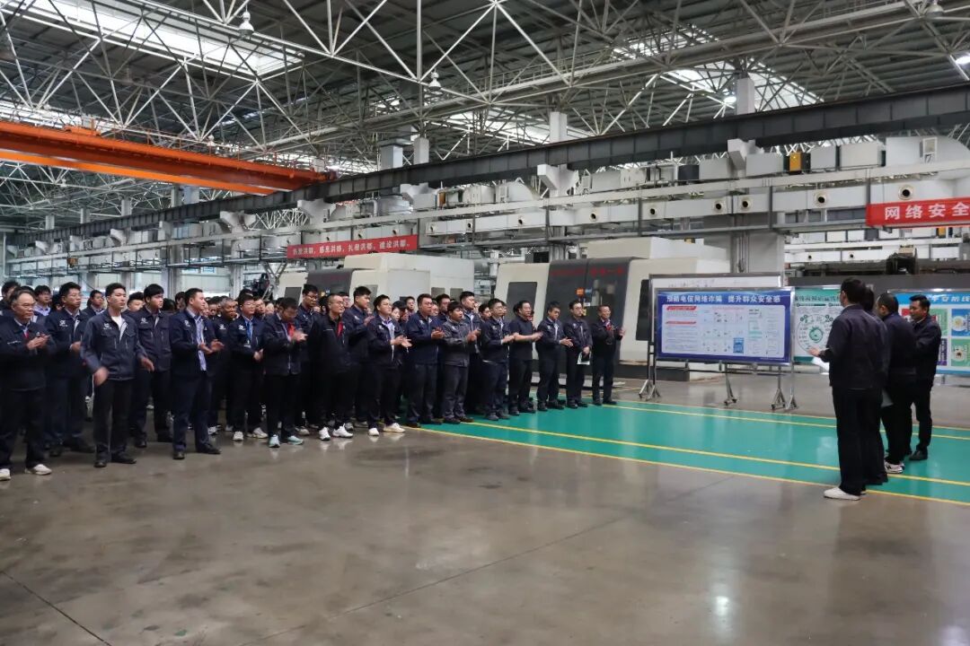 领导班子带队到生产一线,对现场机床设备进行开工前全面检查,确保设备状态良好、运行安全。现场大屏循环播放安全生产注意事项,提醒全员绷紧安全之弦。