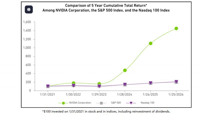 但不可否认的是,投资英伟达是一笔不错的买卖。如果你在 2021 年末向英伟达投资 100 美元,截至 2026 年 1 月 25 日,这笔资产已膨胀至 1448.75 美元。在约四年里,英伟达跑赢了大盘。