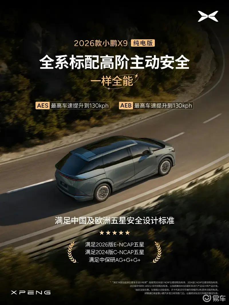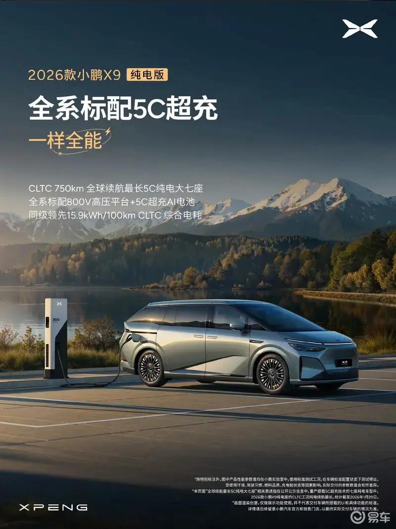 动力方面,2026款小鹏X9纯电版全系标配800V高压平台+5C超充AI电池,CLTC纯电续航750km,CLTC综合电耗15.9kWh/100km。此外,新车全系标配主动式后轮转向,最小转弯半径5.4m,并全系标配RNC降噪。底盘方面,新车搭载智能双腔空气悬架+6液压衬套。