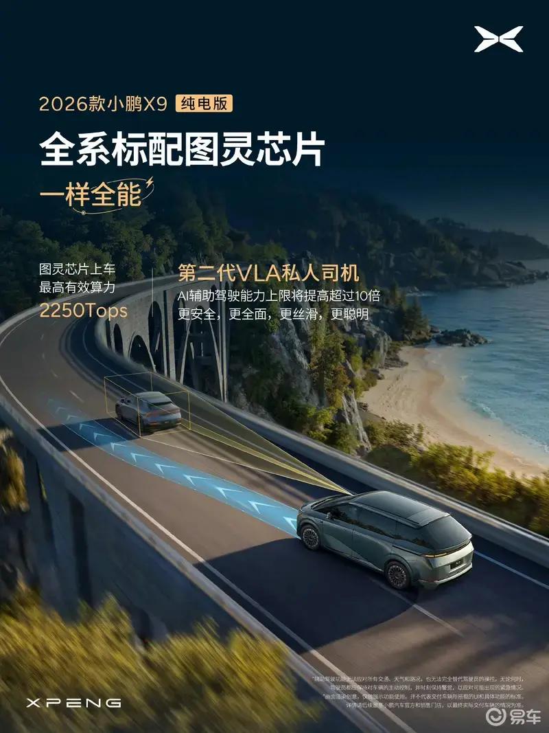 造型方面,2026款小鹏X9纯电版与在售车型基本保持一致。新车全系标配图灵芯片,最高有效算力2250Tops,配备第二代VLA私人司机,AI辅助驾驶能力上限将提高超过10倍,更安全,更全面,更丝滑,更聪明。