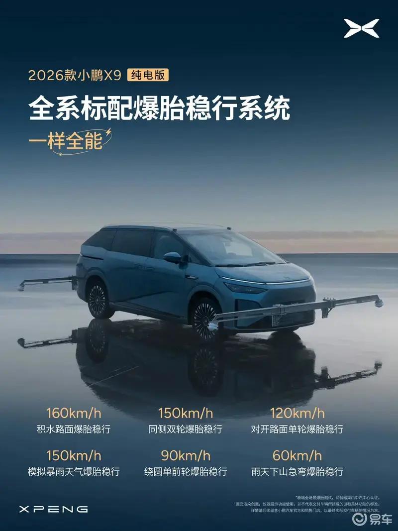 座椅方面,2026款小鹏X9纯电版全系标配三排电动三折叠,提供四座模式、五座模式、六座模式、七座模式。其余配置方面,新车全系标配Nappa真皮座椅、带安全气囊的零重力座椅(可180度躺平)、9安全气囊、爆胎稳行系统。
