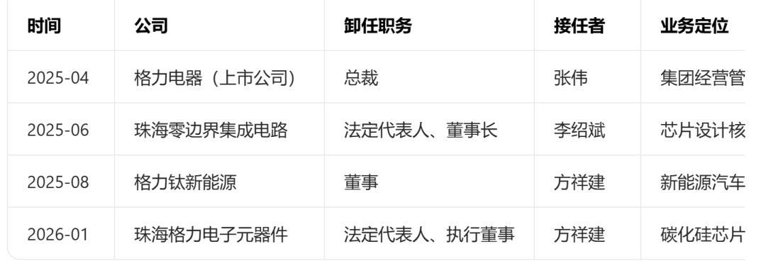 董明珠不仅卸任了格力电器总裁一职,还接连卸任了多家子公司职务。先是2025年6月,董明珠卸任珠海零边界集成电路有限公司法定代表人、董事长。据官方介绍,零边界公司是格力电器进军芯片行业,掌握核“芯”技术的攻坚力量。两个月后,2025年8月,董明珠又卸任格力钛新能源股份有限公司董事。今年1月26日,珠海格力电子元器件有限公司发生重要人事变更,董明珠又卸任了法定代表人、执行董事职务。