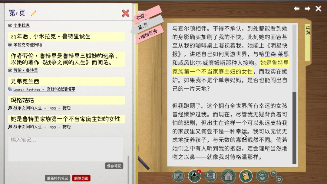 因此,玩家需要仔细阅读和整理手上的证据,对照着墙上的族谱树,根据任何关键词和信息去推理人物关系、生活细节。游戏为此特地准备了高亮标记和笔记功能,方便玩家整理信息、记录猜想和思路。