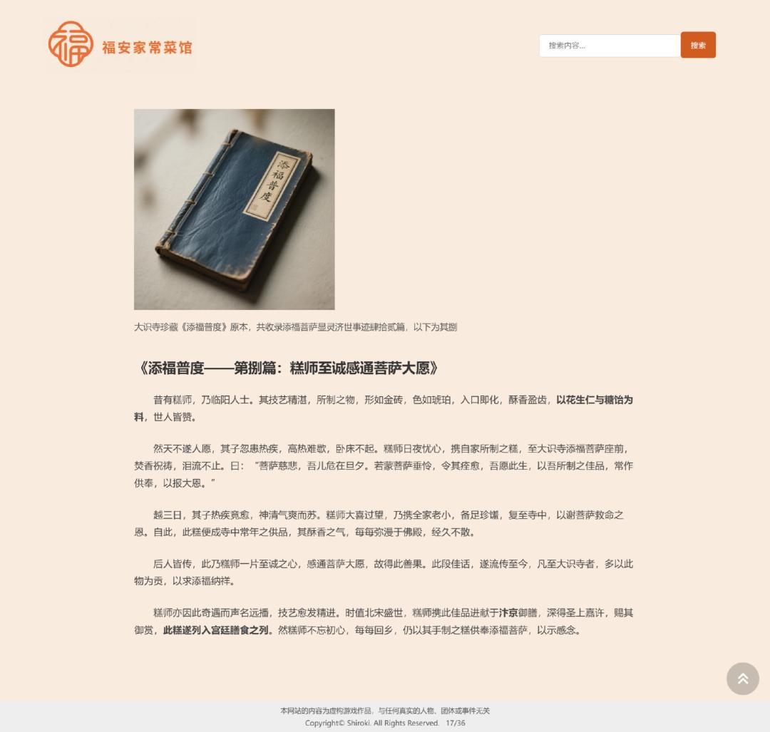 所谓「半ARG」,游戏中的一部分检索内容是与现实相链接的,玩家需要从网站外的现实网络中寻找线索。实际上,由于「在网页中找线索」的思维惯性,需要从现实衍生出关键词的地方常常是意识不到的,因此相对更容易卡关。比如下面这个页面,需要在现实中检索一下用花生仁和糖饴做成的糕点叫什么,才能得出「花生糕」这个关键词,填入搜索框,触发新的关键信息页面。