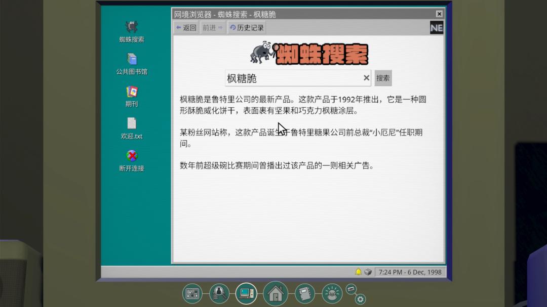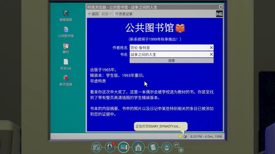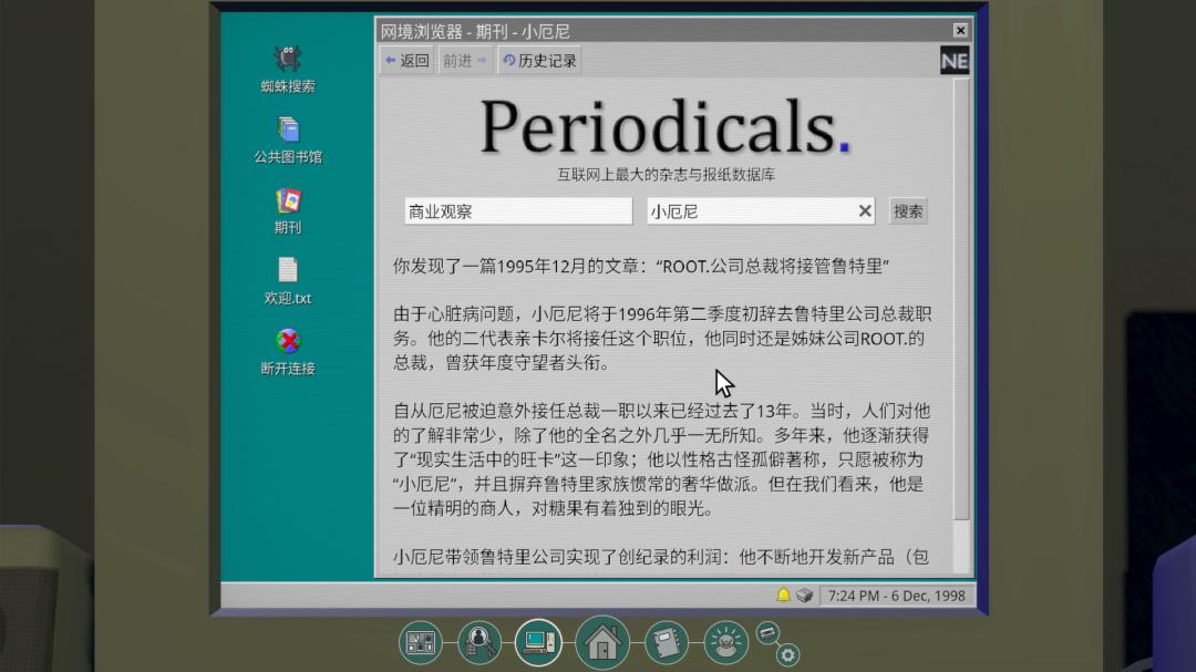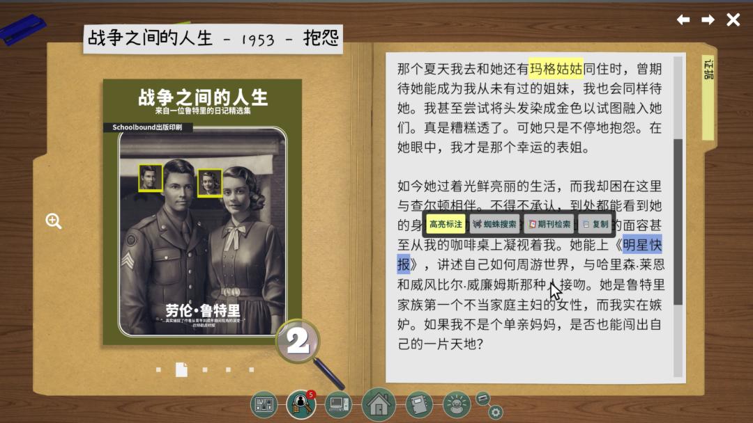 《鲁特里一家死了》就是这样一款类ARG游戏,玩家需要在游戏内通过检索网络、查阅杂志和书籍,逐步还原鲁特里家族的家谱,同时揭开家族中掩盖的谜团。游戏其实在2023年的全球游戏创作节(Global Game Jam)完成了制作,最初是作为免费的浏览器游戏发布的。Steam版本将插图、UI、场景等进行了全面升级。