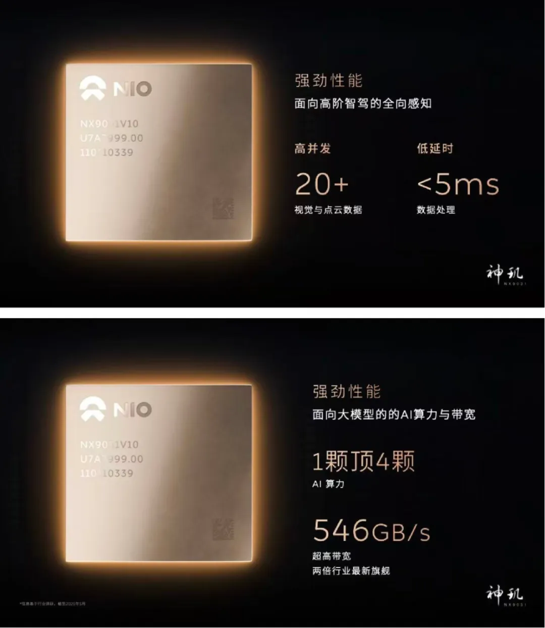 除了产品线的扩大,技术方面蔚来也在“求变”。2025年4月底,蔚来自研的神玑NX9031智能驾驶芯片随着ET9的交付正式量产上车,这款5nm工艺的芯片,单颗算力突破1000TOPS,性能远超当前单颗算力700TOPS的英伟达Thor芯片。