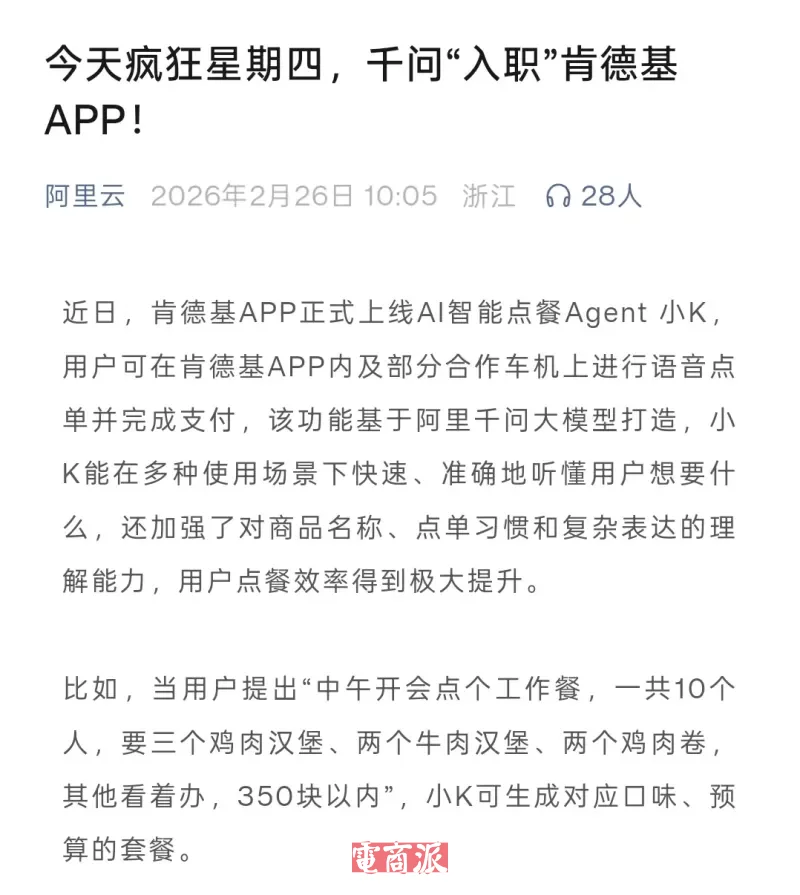 简言之,千问App的“一句话办事”能力正被移植到肯德基App中。