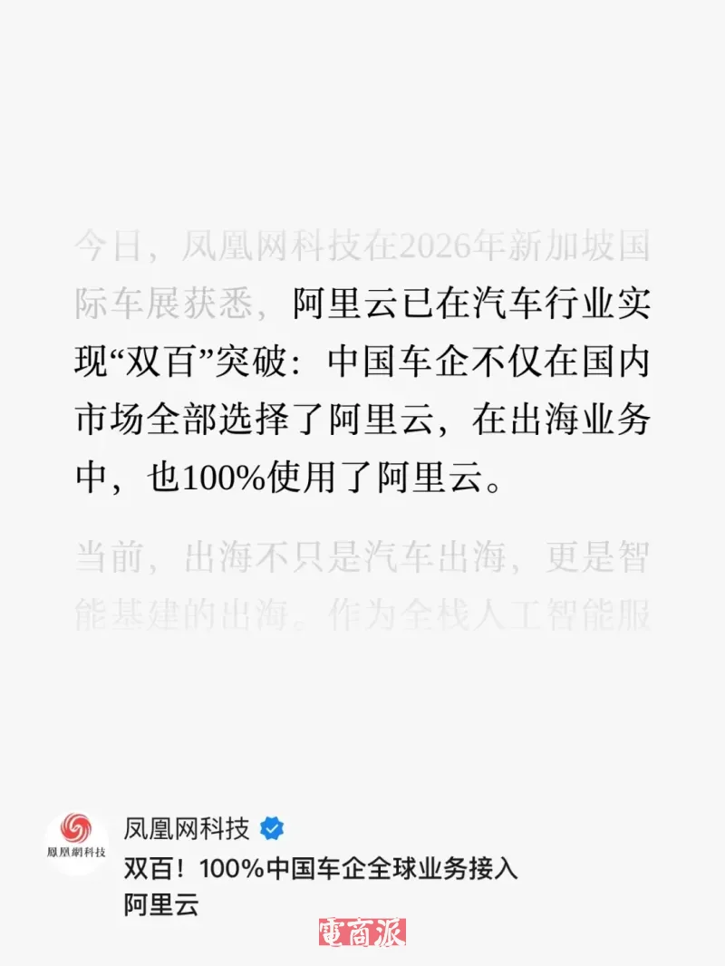 据凤凰网科技获悉,目前,所有中国车企在国内均使用阿里云;且在它们的出海业务中,阿里云的使用率也达到了100%。