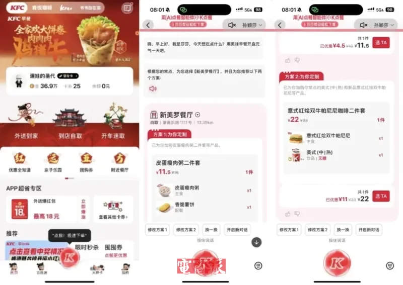 最近,阿里云宣布,肯德基在APP上线了一个新功能——AI智能点餐助手“小K”。该助手基于阿里千问大模型打造,是真正能帮用户点餐的智能体。用户打开肯德基APP,动动嘴就能完成从点单到支付的全流程。