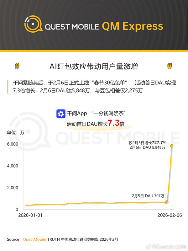 短期补贴的流量效应立竿见影,QuestMobile数据显示,千问春节红包活动首日(2月6日),日活跃用户(DAU)实现727.7%的大幅增长,达到5848万,较前一日增加超5100万,与豆包的DAU差距缩小至2275万;较早启动红包活动的元宝,在活动首日(2月1日)DAU达2399万,较前一日增长2.1倍。