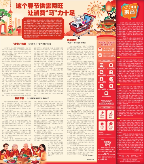 |  春节假期,消费市场一派火热。当春节遇上冬奥时,冰雪运动热潮席卷神州,全民参与热情持续高涨,冰雪经济乘势而上、蓬勃兴起。惠民政策精准发力,以旧换新、有奖发票试点等以“真金白银”撬动消费潜力持续释放,绿色、智能消费需求旺盛,从沉浸式体验到智慧化服务,前沿技术与传统年俗深度交融,为游客解锁了别样年味儿。2026年春节档,“电影+”融入城乡街巷、走进日常生活,影院新片云集,点燃春节观影热情;票根跨界联动,促进电影周边消费;影旅融合加速,激发假日经济活力。春节假期,各地开展“乐购新春”春节特别活动,安排20.5亿元资金,通过发放消费券、补贴等形式,直接惠及广大消费者,政策加力带动消费活力加速释放。新春消费“马”力全开,为经济发展注入强劲动力。