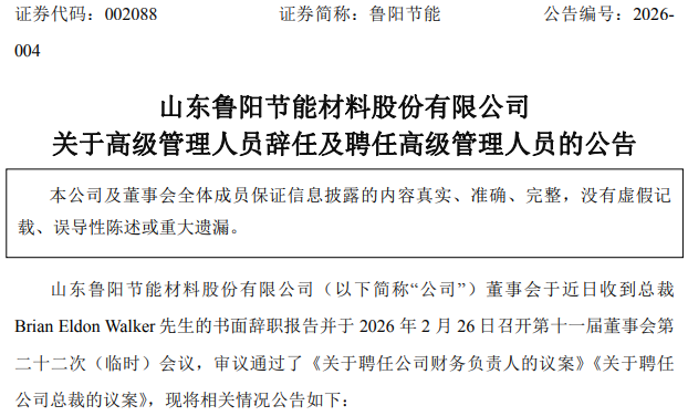 2026年2月27日,深交所主板上市公司鲁阳节能(002088.SZ)发布了《关于高级管理人员辞任及聘任高级管理人员的公告》。公告显示,董事会同意聘任邓涛先生为公司财务负责人。