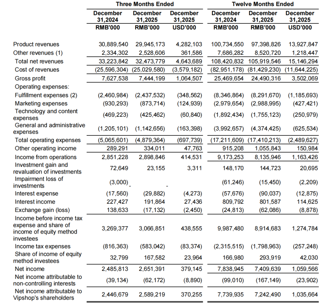 在股东回报方面,唯品会2025年通过股票回购和分红共计回报股东约9.4亿美元。同时,该公司董事会已批准新一轮年度股息派发计划,将向截至2026年4月10日休市后登记在册的股东派发现金股息,派发标准为每股普通股3.10美元、每股美国存托股0.62美元。