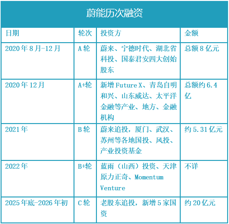 而蔚能自身,C轮之前的融资总额,仅在20亿左右。如果没有2025年C轮的20亿,蔚能无论如何无法吃下那么多电池资产。