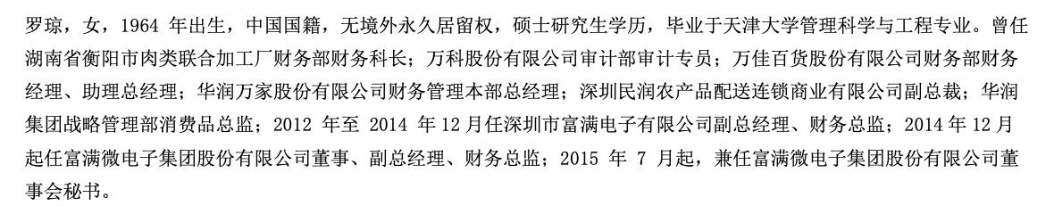 罗琼,女,1964年出生,中国国籍,无境外永久居留权,硕士研究生学历,毕业于天津大学管理科学与工程专业。曾任湖南省衡阳市肉类联合加工厂财务部财务科长;万科股份有限公司审计部审计专员;万佳百货股份有限公司财务部财务经理、助理总经理;华润万家股份有限公司财务管理本部总经理;深圳民润农产品配送连锁商业有限公司副总裁;华润集团战略管理部消费品总监;2012年至2014年12月任深圳市富满电子有限公司副总经理、财务总监;2014年12月起任富满微电子集团股份有限公司董事、副总经理、财务总监;2015年7月起,兼任富满微电子集团股份有限公司董事会秘书。