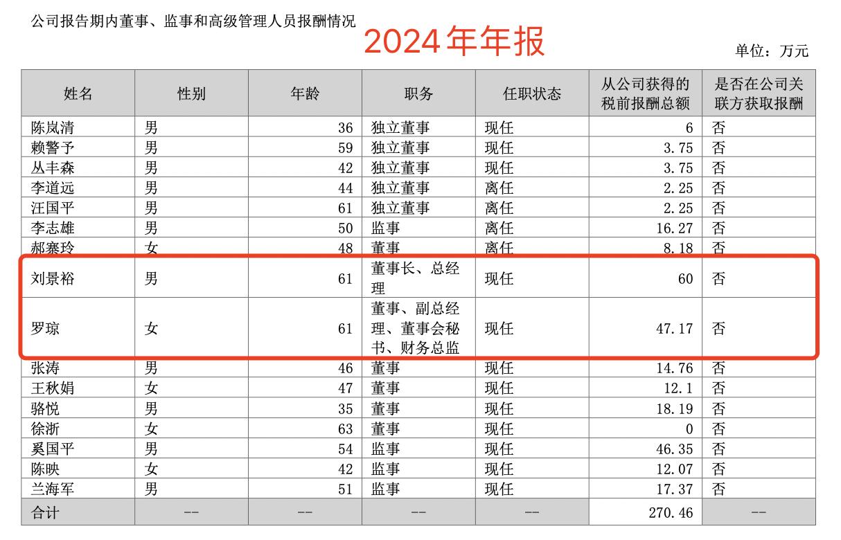 薪酬方面,2024年董事长、总经理刘景裕的年薪为60万元,而2023年其年薪为65万元;董事、副总经理、董事会秘书、财务总监罗琼的年薪为47.17万元,而2023年其年薪为49.49万元。