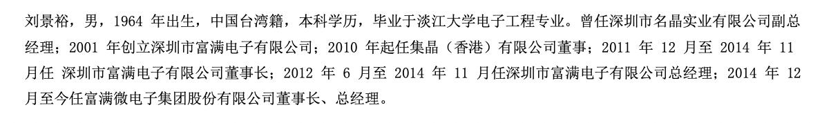资料显示,刘景裕,男,1964年出生,中国台湾籍,本科学历,毕业于淡江大学电子工程专业。曾任深圳市名晶实业有限公司副总经理;2001年创立深圳市富满电子有限公司;2010年起任集晶(香港)有限公司董事;2011年12月至2014年11月任深圳市富满电子有限公司董事长;2012年6月至2014年11月任深圳市富满电子有限公司总经理;2014年12月至今任富满微电子集团股份有限公司董事长、总经理。