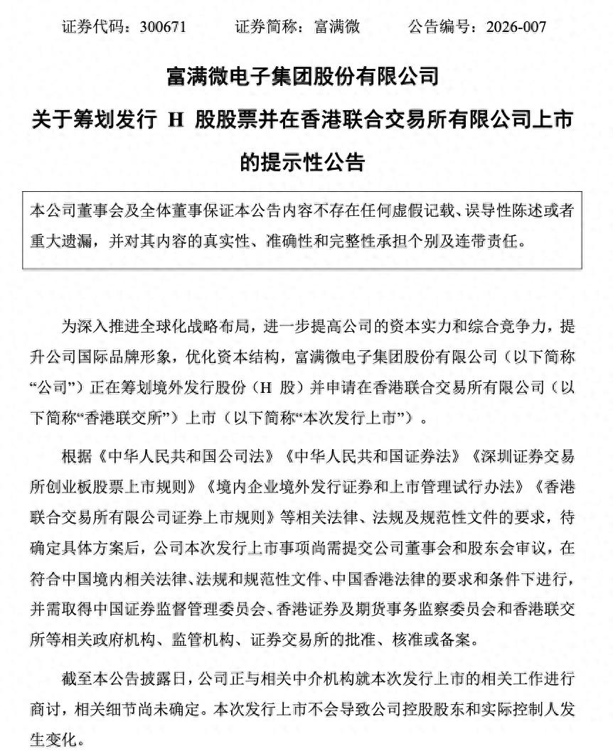富满微发布公告称,为深入推进全球化战略布局,进一步提高公司的资本实力和综合竞争力,提升公司国际品牌形象,优化资本结构,公司正在筹划境外发行股份(H 股)并申请在香港联合交易所有限公司(以下简称“香港联交所”)上市。