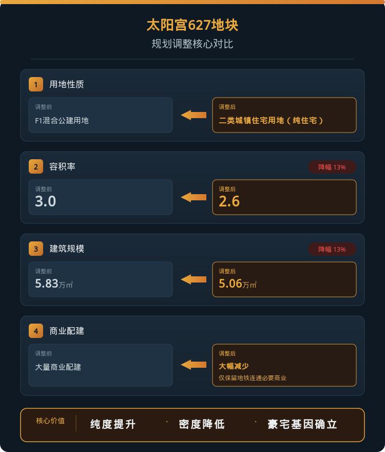 用地性质从F1混合公建直接调整为二类城镇住宅用地,容积率从3.0降到2.6,建筑规模从5.83万平方米减到5.06万平方米。这使得地块更加纯粹,也拥有了豪宅底色。