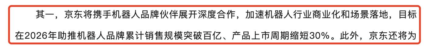 其中一则消息是,京东正式发布“机器人产业服务全景图”,定下目标在2026年助推机器人品牌累计销售规模突破百亿、产品上市周期缩短30%。