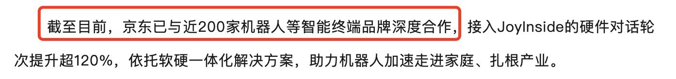 同时,据京东披露,其已与近200家机器人等智能终端品牌深度合作,接入JoyInside的硬件对话轮次提升超120%,依托软硬一体化解决方案,助力机器人加速走进家庭、扎根产业。
