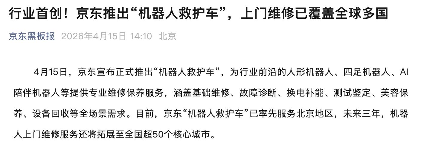 另一则消息是,京东宣布正式推出“机器人救护车”,为行业前沿的人形机器人、四足机器人、AI陪伴机器人等提供专业维修保养服务,涵盖基础维修、故障诊断、换电补能、测试鉴定、美容保养、设备回收等全场景需求。