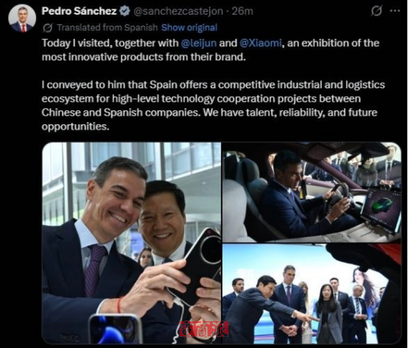 桑切斯访问结束后发布推文:“今天我与雷军一同参观了小米最具创新性的产品展示。我向他表示,西班牙具备极具竞争力的产业与物流生态体系,可为中西企业间的高端技术合作项目提供支撑。我们拥有人才、可靠的保障以及未来的发展机遇。”