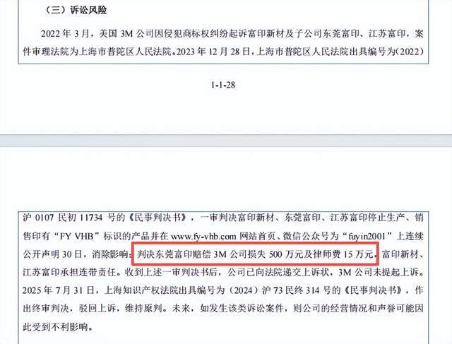 2023年至2025年,富印新材营收从5.35亿元稳步增至7.59亿元。但与营收曲线并行的,还有一段与全球胶粘剂巨头3M持续多年的法律纠葛——2025年7月,公司商标侵权案终审败诉,被判向3M赔偿损失及律师费合计515万元。此外,3M已进一步针对其产品OCA光学胶、丙烯酸泡沫胶提起专利侵权诉讼,目前该案仍未公布具体细节。