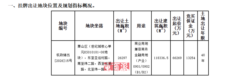 该地块成交楼面价为5600元/平方米。用地性质为商业用地兼容商务金融用地(产业),出让面积26297平方米,可建面积11.83万平方米,建筑高度不高于100米、不低于15米,起拍总价66269万元,起拍楼面价5600元/平方米。