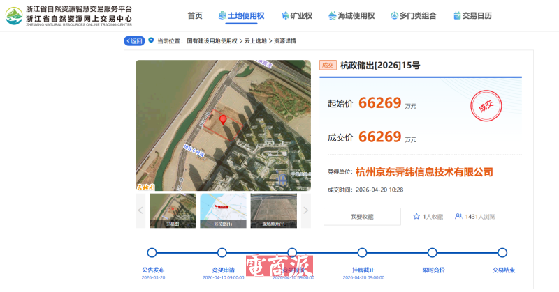 4月20日消息,浙江省自然资源网上交易中心公布的信息显示,杭州钱江世纪城核心区一宗沿江商业用地挂牌出让,杭州京东霁纬信息技术有限公司以总价6.63亿元成功竞得该地块。杭州京东霁纬信息技术有限公司由北京京东世纪贸易有限公司100%持股。