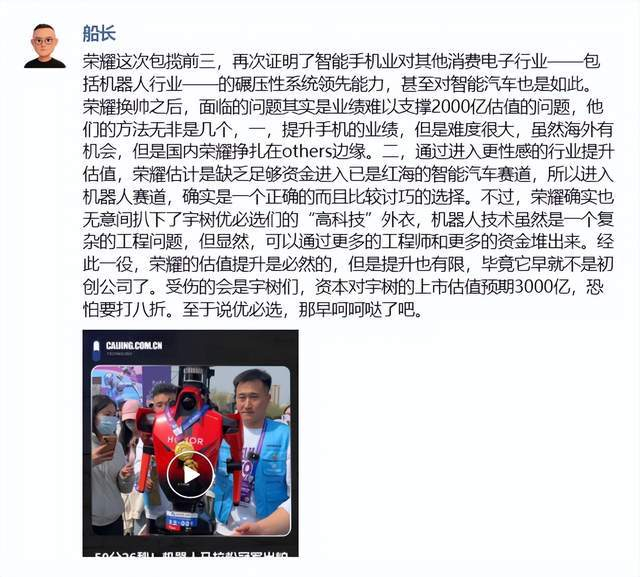 经此一役,荣耀的估值提升是必然的,但是提升也有限,毕竟它早就不是初创公司了。受伤的会是宇树们,资本对宇树的上市估值预期3000亿,恐怕要打八折。至于说优必选,那早呵呵哒了吧。