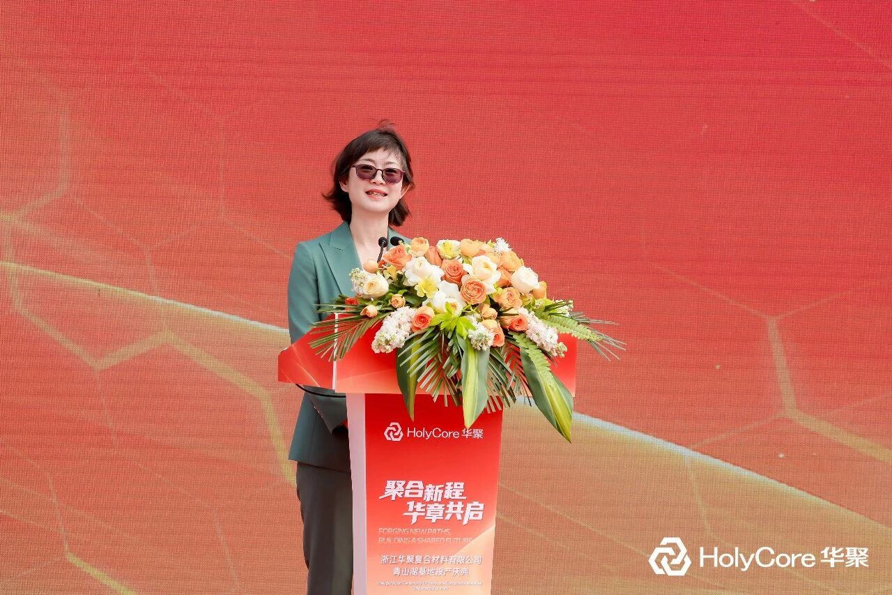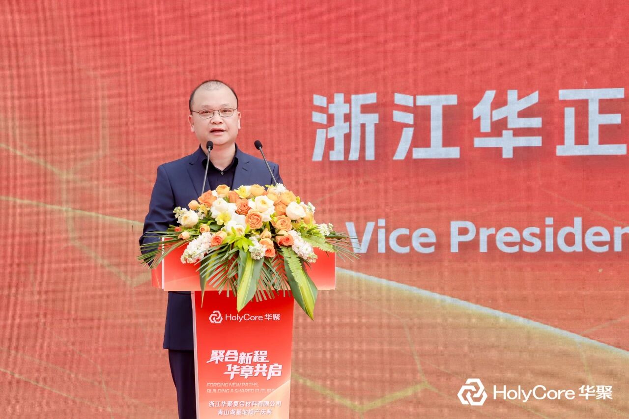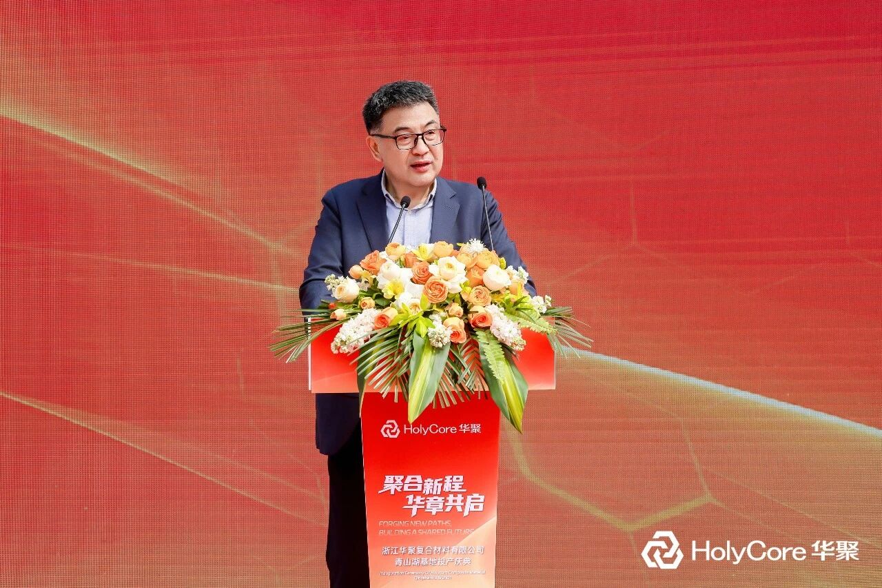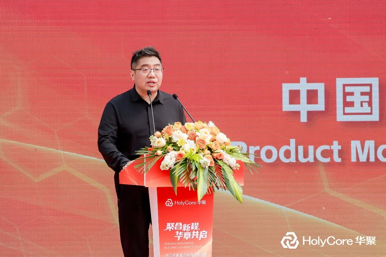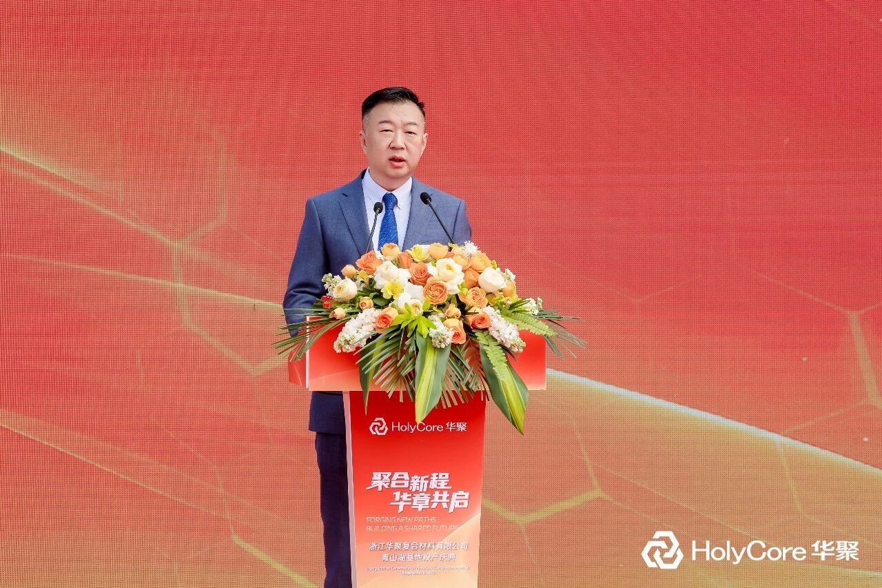 华正新材副总裁、浙江华聚复合材料有限公司总经理刘宏生在致辞中表示,华聚青山湖基地的投产,为企业提供了更大更强的平台。他回顾了千年良渚匠心、吴越务实精神与陆羽“精行俭德”之道对这片土地的滋养,感谢华立集团、华正新材的引领与支持,以及全球客户和供应商伙伴的长期信任。他指出,华聚十余年来专注于热塑、热固性三明治板材的研发与生产,未来将坚持“以塑代钢、以塑代木”的创新之路,引入PET泡沫、碳纤维等新型材料,持续提升产品性能,并向动力电池、低空飞行器等新兴领域拓展。他表示,华聚将继续以“创新材料、驱动未来”为使命,与合作伙伴携手共进,用更好的产品和服务助力产业升级,增进社会福祉。