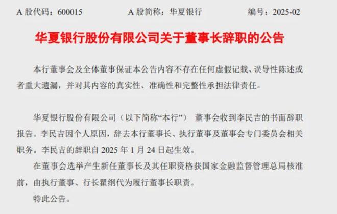 2025年1月27日,当时春节前A股最后一个交易日的盘后,华夏银行突然扔出一颗重磅炸弹:执掌该行近8年的董事长李民吉,因“个人原因”辞去董事长、执行董事等全部职务。