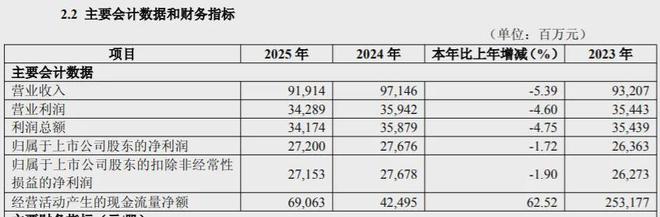 但与规模狂奔形成刺眼反差的,是盈利端的全线溃败。全年营业收入919.14亿元,同比下降5.39%;归母净利润272亿元,同比下降1.72%,净利润增速在A股42家上市银行中稳居末位梯队。